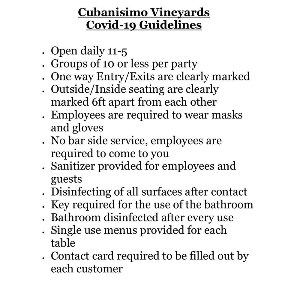 Our Tasting Room is open from 11 am – 5 pm daily for curbside pickup and outside tastings only, as well as holiday shopping. Complimentary local delivery is available when purchasing 3 bottles or more. Thank for your support and understanding. Happy Holidays from our Cubanisimo family to yours!